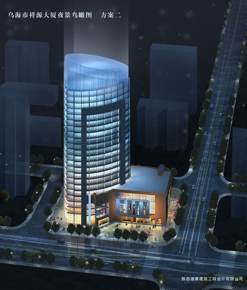 祥源大廈位于內(nèi)蒙古烏海市,由于烏海位于沙漠邊緣,基本沒有農(nóng)業(yè)產(chǎn)業(yè),是一個(gè)礦產(chǎn)及工業(yè)性的城市,為了打破城市原有的、單一的城市風(fēng)貌,平面布局設(shè)計(jì)為一個(gè)橢圓形的塔樓,并在立面設(shè)計(jì)時(shí)采用大面積的玻璃幕墻,最大限度的采光并提升城市品味。